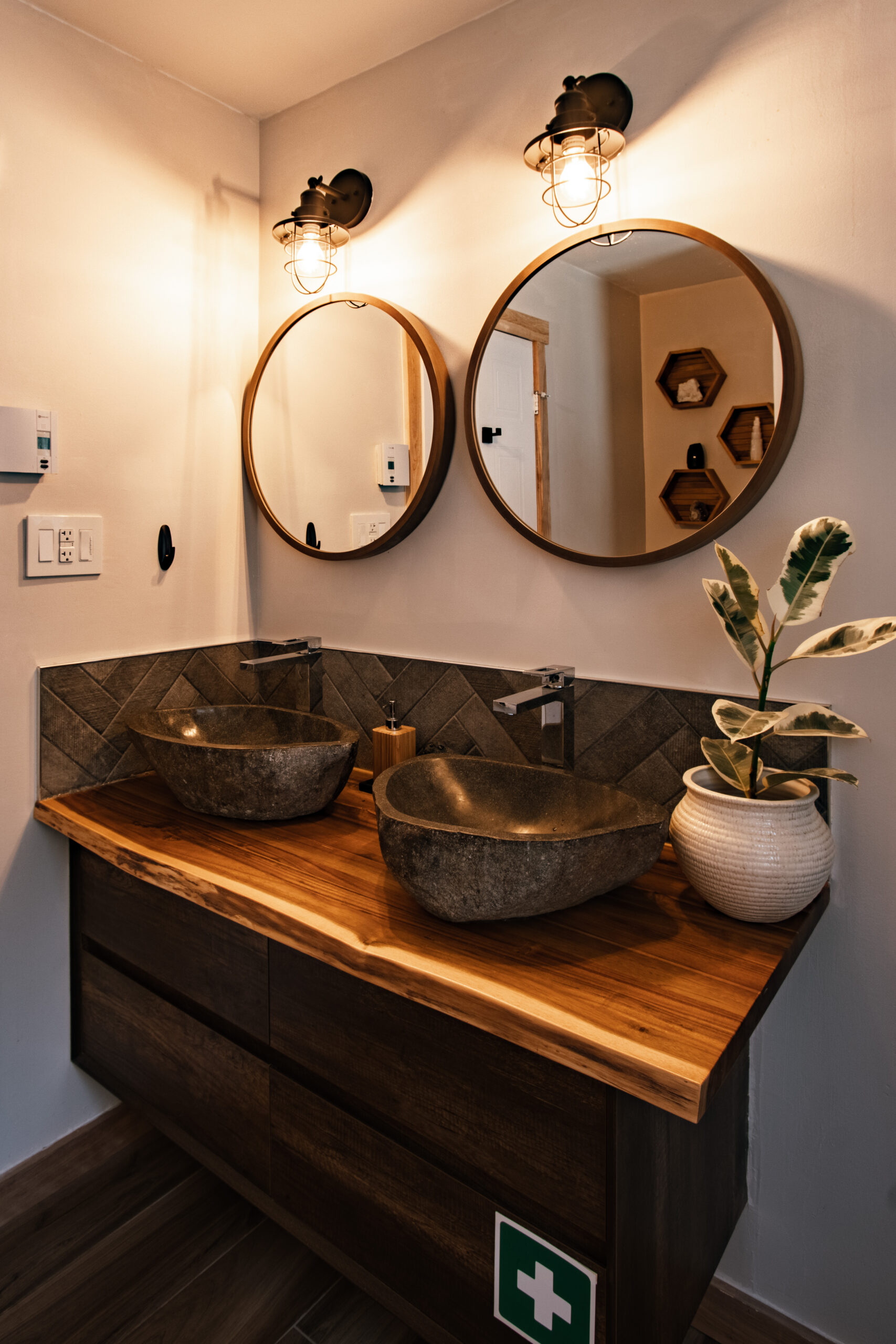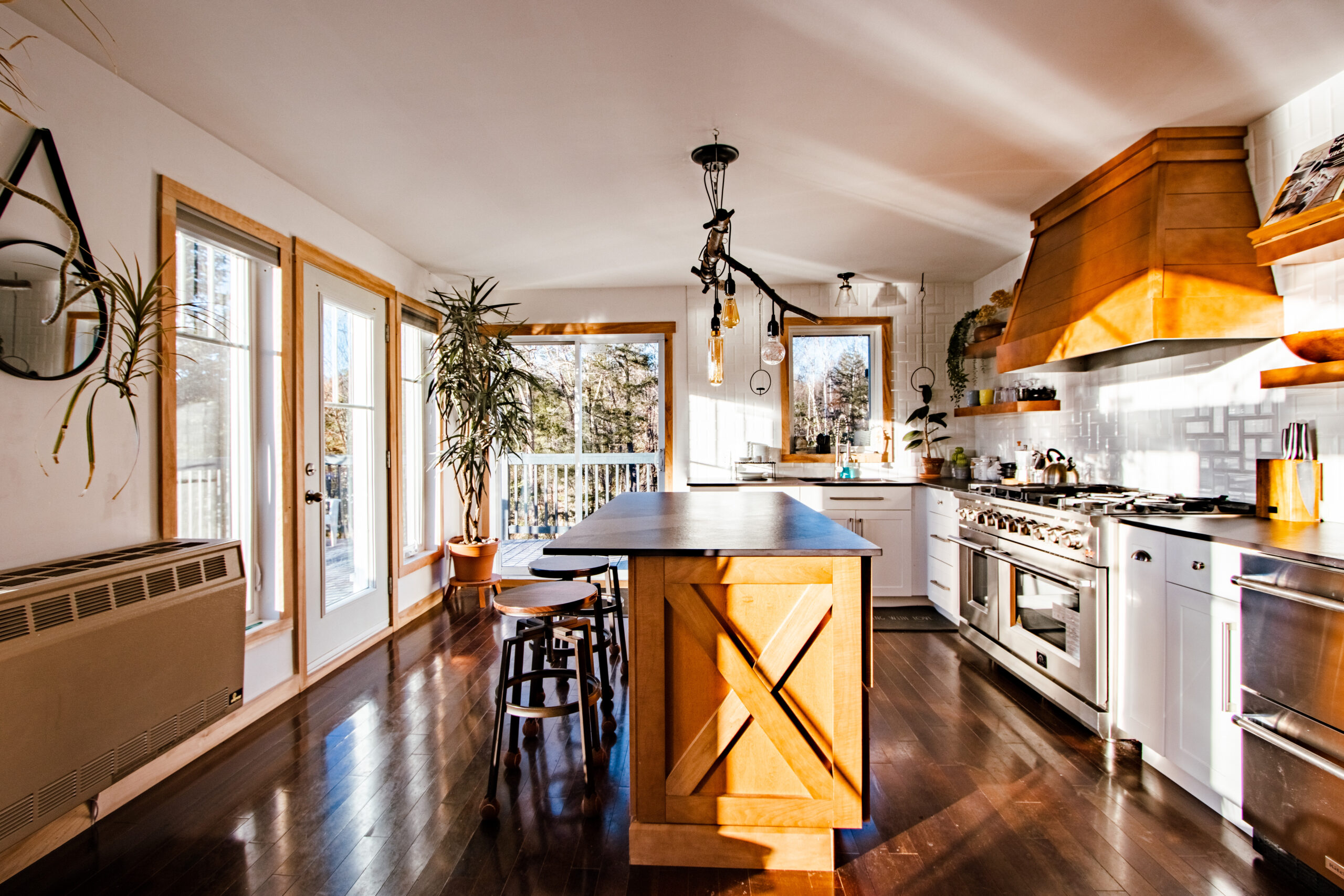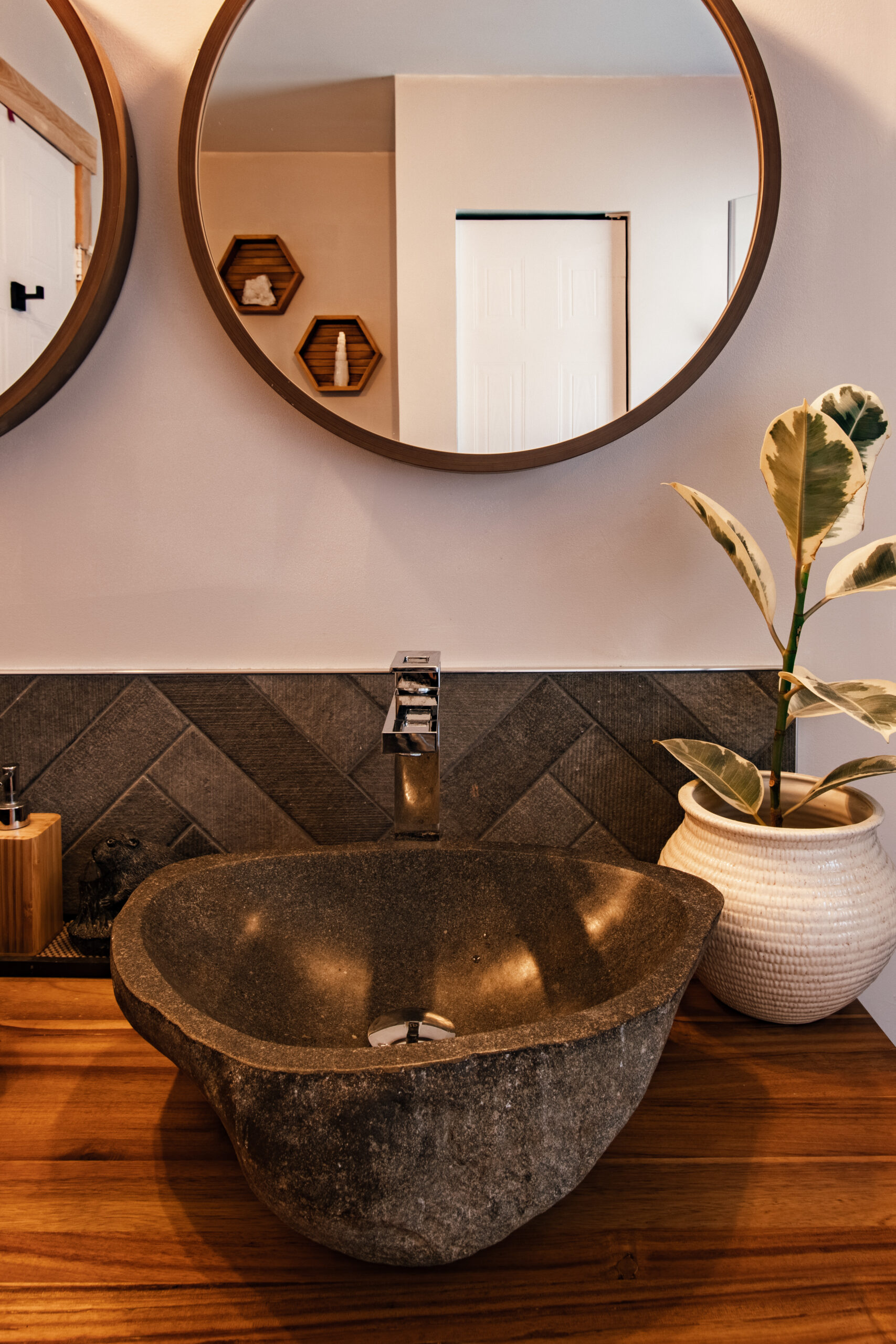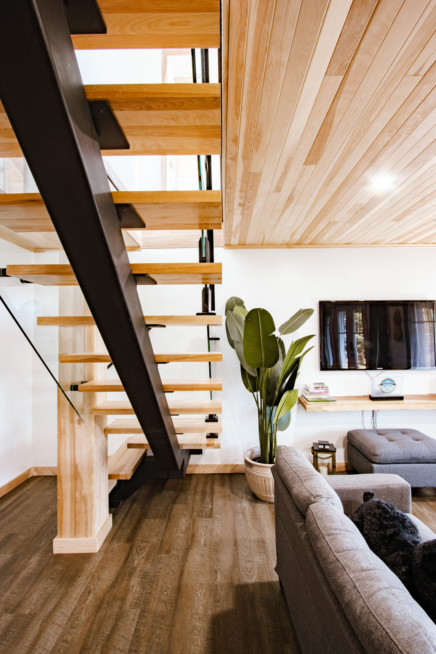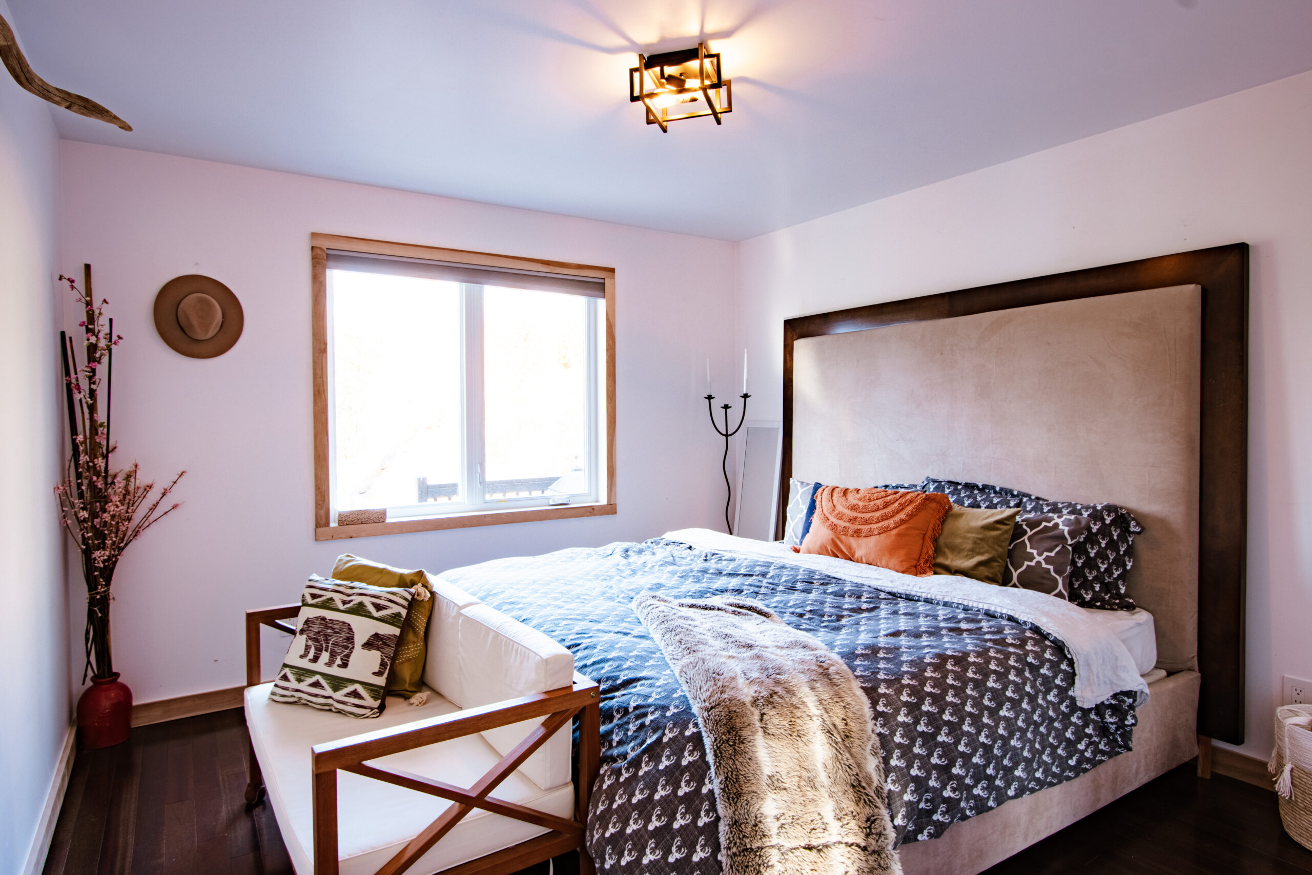 The dining table also offers seating for six and provides plenty of opportunities to enjoy a meal, away from screens and noise as you enjoy the crackling of the wood burning fireplace. The large kitchen has the perfect combination of ambiance, functionality & sleek design with custom black dekton countertops, high-end stainless-steel appliances, fully-stocked with utensils, dishware, high-quality cookware. The beautiful center island is perfect for a cutting board and wine or a spread to entertain. There are 3 bedrooms; the master bedroom offers a king size bed, the 2nd bedroom upstairs offers a queen size bed and a 2nd master bedroom on the garden level has a queen size bed with a private entry. The upstairs bathroom has a double vanity, a rainfall shower with a toilet bowl and a closet. The downstairs bathroom has a vanity, shower and toilet bowl.